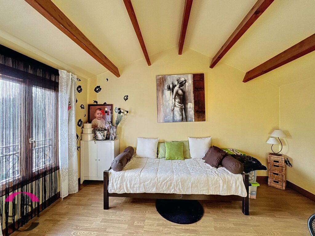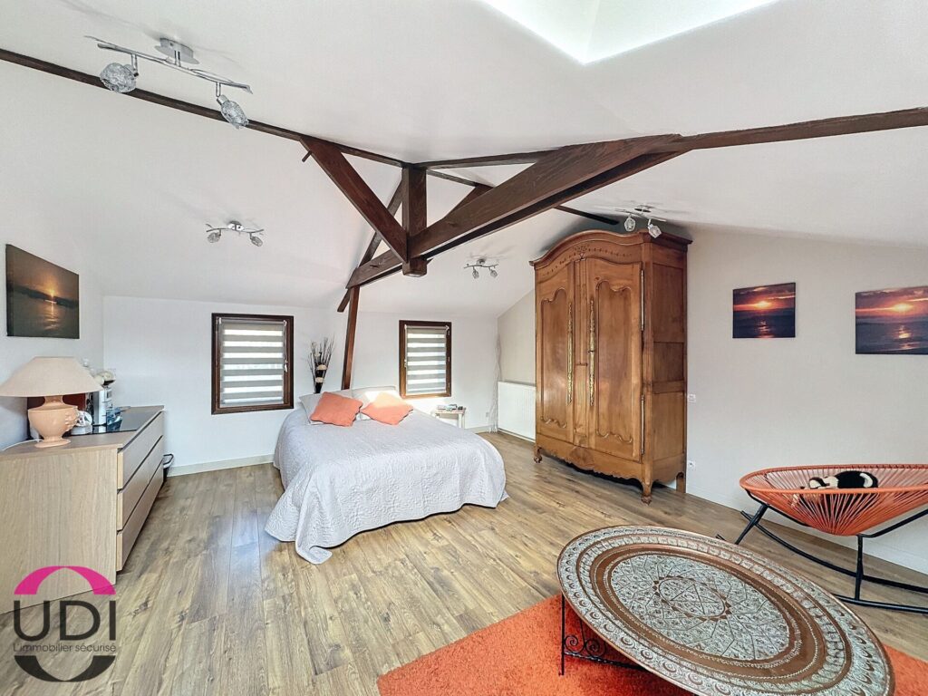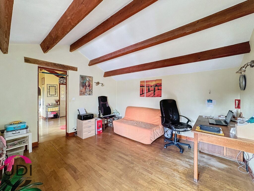 – A l’étage : palier desservant un bureau, 1 chambre double, 2 grandes chambres, salle de bains avec wc