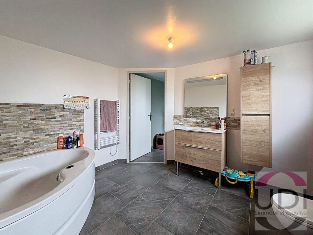 – en rez-de-chaussée: une pièce de vie lumineuse avec poêle à granulés, une cuisine équipée ouverte sur le salon, deux chambres et une salle de douche à finir ( paroi, colonne de douche, vasque )