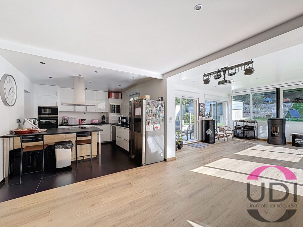 – Au Rez-de-Chaussée : Entrée avec rangements desservant un beau séjour triple avec espace salon et son poêle à bois, un second espace séjour avec poêle à granulés donnant sur une belle cuisine équipée ouverte de qualité ainsi que son arrière cuisine avec espace buanderie, un bureau pouvant servir de chambre avec une extension en attente pour une possible salle d’eau attenante à la chambre.