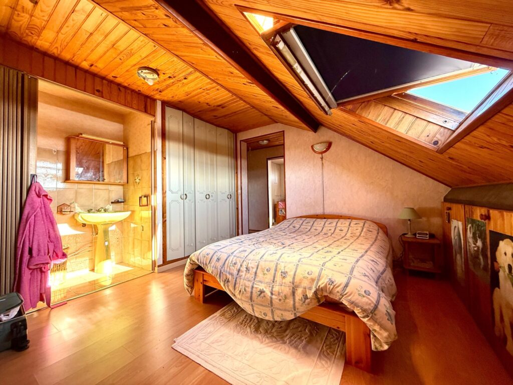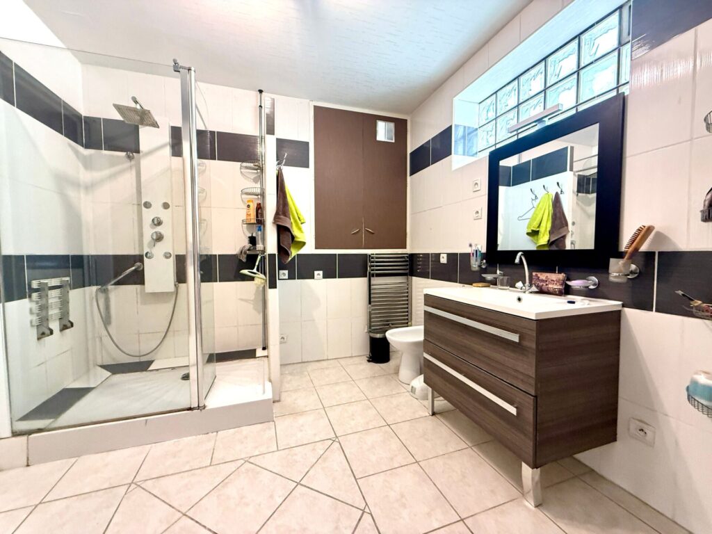 – en remplacement du garage à été crée un appartement type t2 de presque 60m² avec pièce de vie de 39m² avec coin cuisine, chambre de 13m², dressing salle d’eau avec wc, idéale pour investissement ou profession libérale