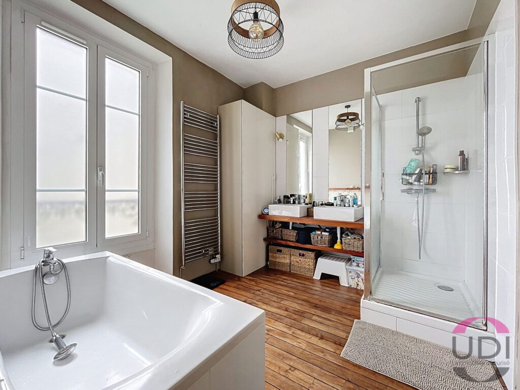 Au premier étage, un palier dessert trois chambres dont une avec dressing, une salle de bains équipée d’une baignoire, d’une douche, et d’un WC indépendant.
