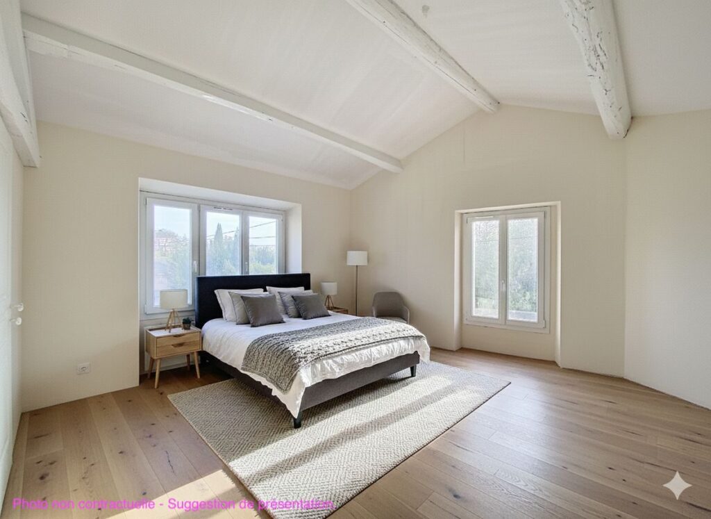 A l’étage : Deux chambres dont une avec salle d’eau, une salle d’eau, un WC indépendant.