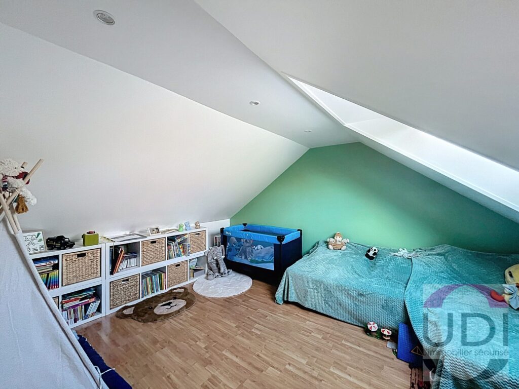 A l’étage : palier desservant deux chambres, une salle de bains, wc séparé.