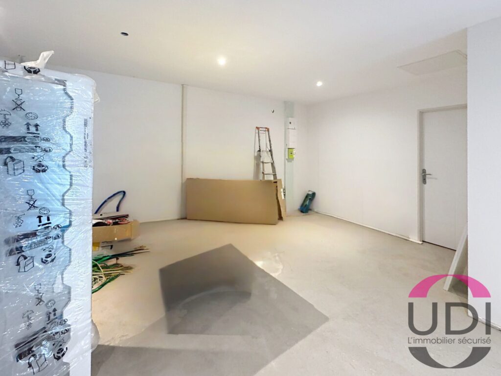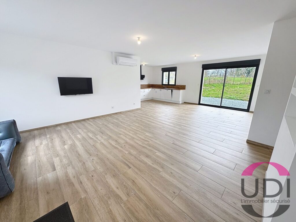 Entrée sur séjour avec cuisine ouverte.